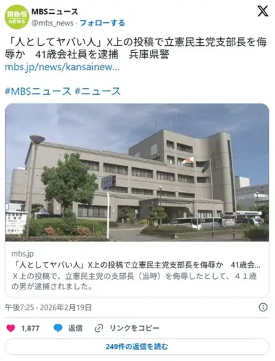 「人としてヤバい人」X上の投稿で立憲民主党支部長を侮辱か 41歳会社員を逮捕 兵庫県警