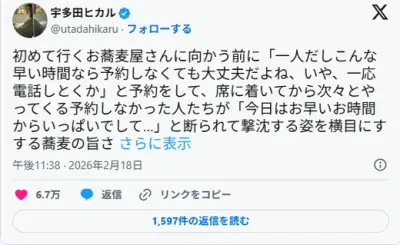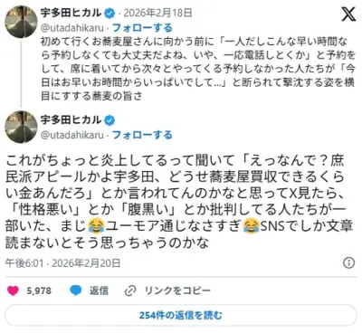 宇多田ヒカル「そば屋」投稿炎上に言及「まじ ユーモア通じなさすぎ SNSでしか文章読まないとそう思っちゃうのかな」