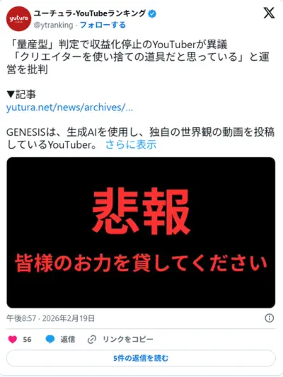 AI動画系Youtuber、収益化停止に激おこ「クリエイターを使い捨ての道具だと思っている」と運営を批判