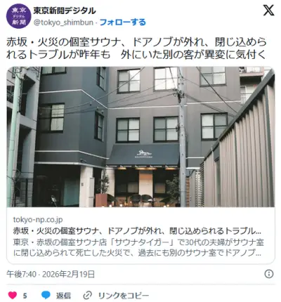 赤坂サウナ蒸し殺し事件、昨年もドアノブが壊れ閉じ込め事故→社長が対策拒絶「押戸は熱が逃げる」