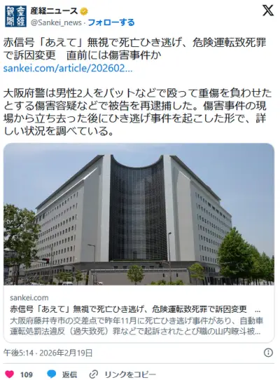 【大阪】赤信号「あえて」無視で死亡ひき逃げ、危険運転致死罪で訴因変更 直前には傷害事件か