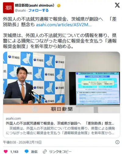 外国人の不法就労通報で報奨金、茨城県が創設へ 朝日「差別を助長するおそれ」