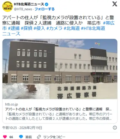アパートの住人が「監視カメラが設置されている」と警察に通報 探偵2人逮捕 通路に侵入か 帯広市