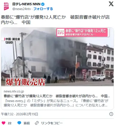 春節に“爆竹店”が爆発12人死亡か 破裂音響き破片が店内から… 中国