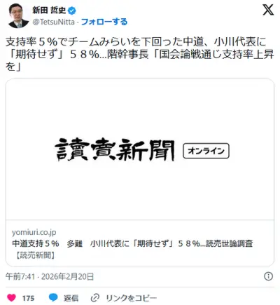 【中道】支持率5%、代表に「期待せず」58%(読売)…党関係者「『追及ばかりの野党』から殻を破れるかどうかが課題」