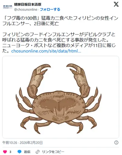 インフルエンサー、スベスベマンジュウガニを食べ死亡