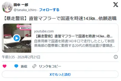 【暴走警官】直管マフラーで国道を時速143㎞…依願退職 秋田県警