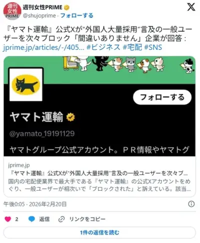 『ヤマト運輸』公式Xが“外国人大量採用”言及の一般ユーザーを次々ブロック「間違いありません」企業が回答
