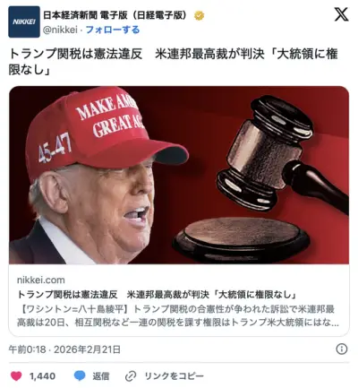 トランプ関税は憲法違反 米連邦最高裁が判決「大統領に権限なし」