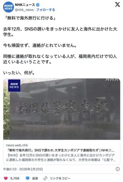 「無料で海外旅行に行ける」と誘われてカンボジアに行った大学生が行方不明