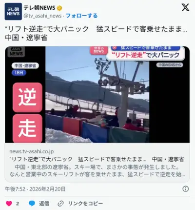 “リフト逆走”で大パニック 猛スピードで客乗せたまま… 中国