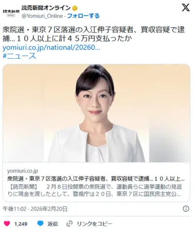 衆院選・東京7区落選の入江伸子容疑者、買収容疑で逮捕…10人以上に計45万円支払ったか