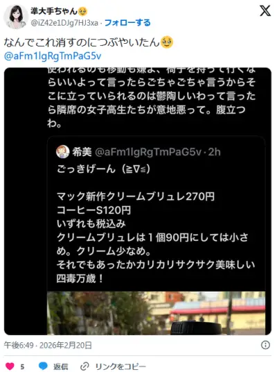 女、マックで6人がけのテーブルで1人でゆったりお茶してたら高校生に「移動して」と言われ発狂wwwwwwww