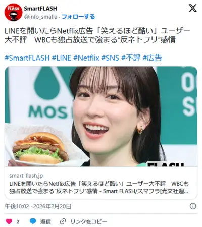 LINEを開いたらNetflix広告「笑えるほど酷い」ユーザー大不評 WBCも独占放送で強まる“反ネトフリ”感情