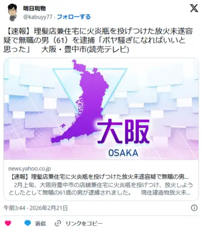【大阪】理髪店兼住宅に火炎瓶を投げつけた放火未遂容疑で無職の男(61)を逮捕「ボヤ騒ぎになればいいと思った」