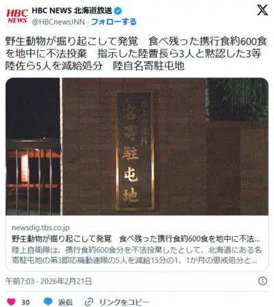 野生動物が掘り起こして発覚 食べ残った携行食約600食を地中に不法投棄 陸曹長と3等陸佐ら5人を減給処分 陸自名寄駐屯地