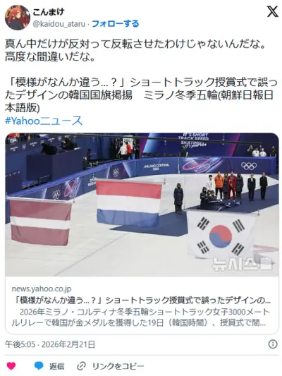 ミラノ五輪、韓国国旗を間違える…謎の3本線が左右反転したものを使用