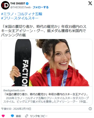 【五輪】アメリカ出身で中国代表、年収35億円のスキー女王アイリーン・グー、銀メダル獲得も米国内でバッシングの嵐