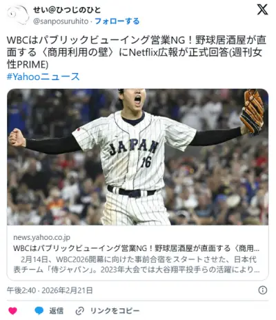 WBCはパブリックビューイング営業NG!野球居酒屋が直面する〈商用利用の壁〉にNetflix広報が正式回答