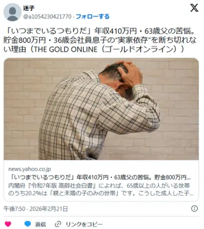【いつまでいるつもりだ】63歳父の苦悩─36歳独身会社員息子の“実家依存”断ち切れぬ理由…「無駄な家賃払う意味無い」に反論できず