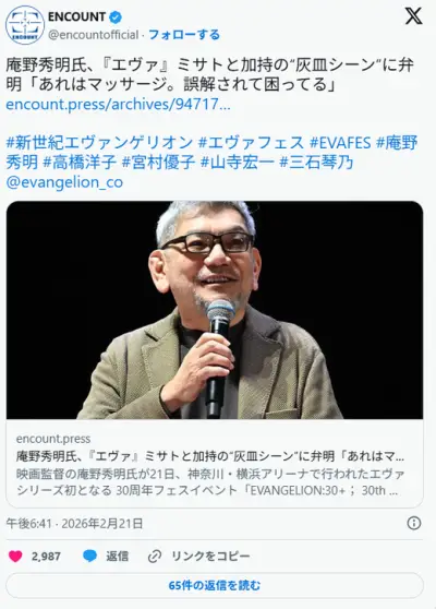 庵野秀明氏、『エヴァ』ミサトと加持の“灰皿シーン”に弁明「勘違いしないで。あれはマッサージ」