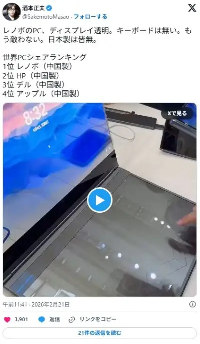 【動画】レノボのPC、ディスプレイ透明。キーボードは無い。もう中国には敵わない。日本製は皆無。