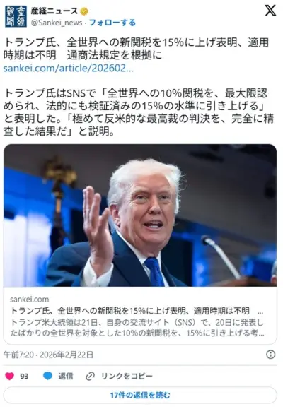全世界関税15%に上げ表明 トランプ氏、時期は不明