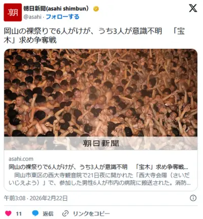 岡山の裸祭りで6人がけが、うち3人が意識不明 「宝木」求め争奪戦