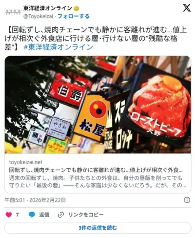 回転ずし、焼肉チェーンでも静かに客離れが進む…値上げが相次ぐ外食店に行ける層・行けない層の残酷な格差