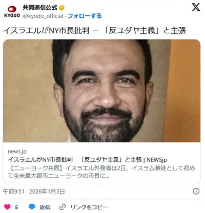 イスラエルがNY市長批判 「反ユダヤ主義」と主張