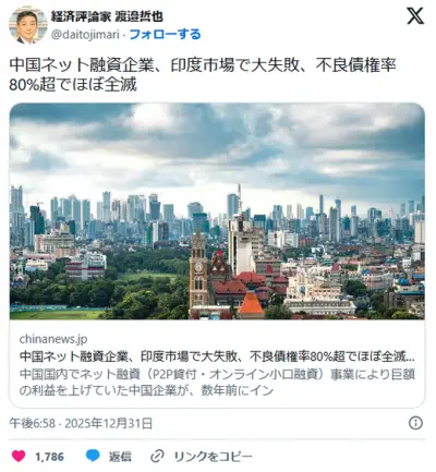 中国ネット融資企業、インド市場で大失敗、不良債権率80%超でほぼ全滅w