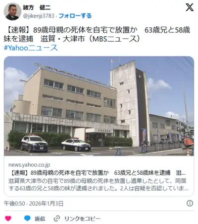 【大津市】89歳母親の死体を自宅で放置か 63歳兄と58歳妹を逮捕