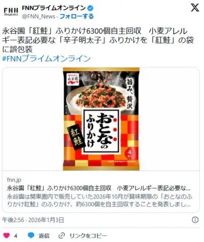 永谷園「紅鮭」ふりかけ6300個自主回収 小麦アレルギー表記必要な「辛子明太子」ふりかけを「紅鮭」の袋に誤包装