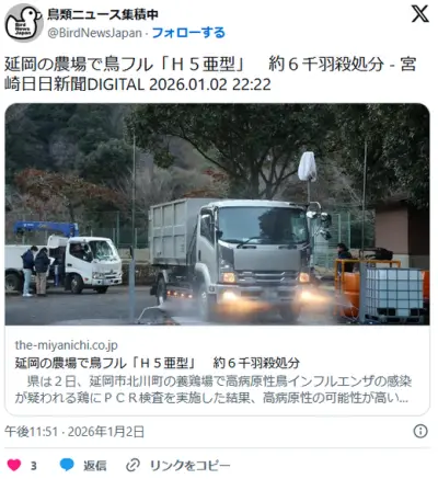 宮崎県でヒト致死率50%の「H5亜型」ウイルスが発生、宮崎県と大分県の半径10キロ圏内を封鎖
