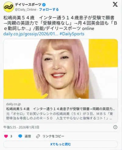 松嶋尚美54歳 インター通う14歳息子が受験で願書→両親の英語力で「受験資格なし」→月4回英会話も「Be動詞しか…」