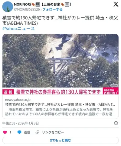 埼玉の神社「ノーマルタイヤの参拝客は帰さない。カレーでも食ってなさい」 180人が足止めwwwwwwwww