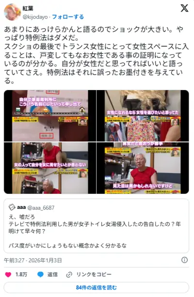 テレビ東京、特例法で戸籍を変更した元男性の女性が女性用公衆浴場へ入ると発言、違法だと指摘相次ぐ
