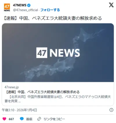 中国政府、アメリカに対しマドゥロ大統領夫婦の即時解放を要求