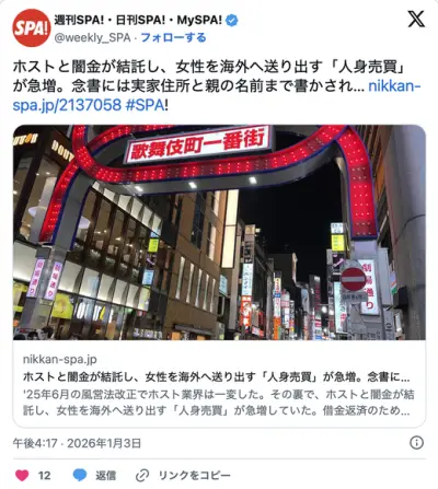 ホストと闇金が結託、売り掛けの女性客を海外へ送る「人身売買」が急増、念書には実家住所と親の名前まで書かされ