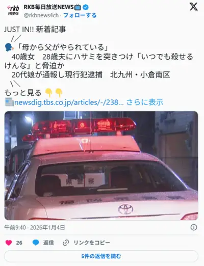 【北九州】「母から父がやられている」40歳女 28歳夫にハサミを突きつけ「いつでも殺せるけんな」と脅迫か 20代娘が通報し現行犯逮捕