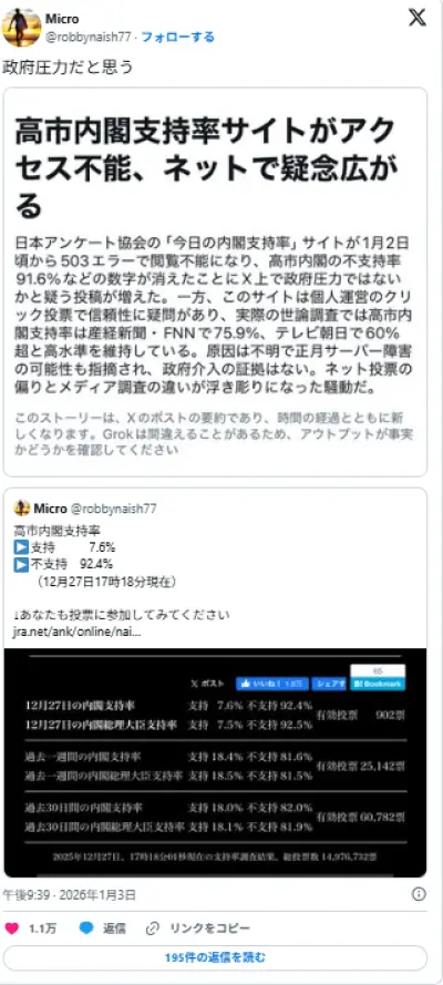 実際の高市支持率が7%で不支持92%と暴いた老舗アンケートHP、何者かによって破壊される