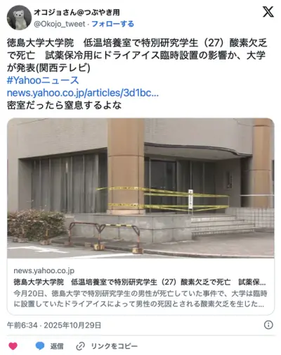 低温培養室で特別研究学生(27)酸素欠乏で死亡 試薬保冷用にドライアイス臨時設置の影響か