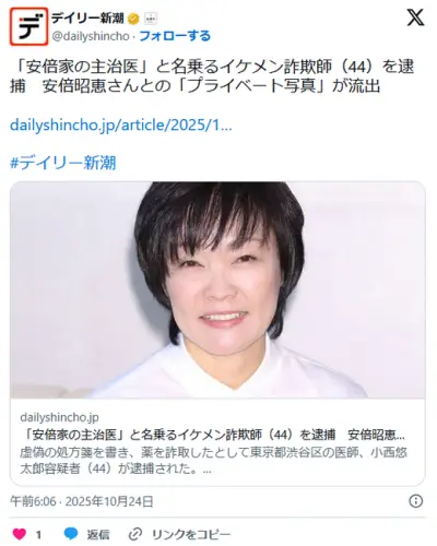 「安倍家の主治医」と名乗るイケメン詐欺師(44)を逮捕 安倍昭恵さんとの「プライベート写真」が流出