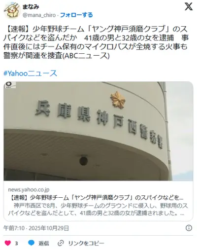 少年野球「ヤング神戸須磨クラブ」のスパイクなど盗んだか 41歳男と32歳女を逮捕 事件直後チーム保有のマイクロバスが全焼の火事も