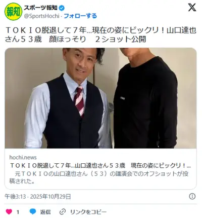 【画像】TOKIO脱退して7年…山口達也さん53歳 現在の姿にビックリ!顔ほっそり 酒止めると痩せるな
