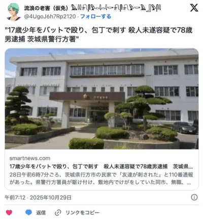 【茨城】17歳無職少年をバットで殴り、包丁で刺す 殺人未遂容疑で78歳無職男逮捕 行方
