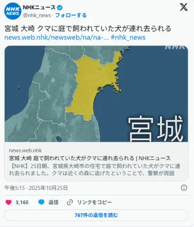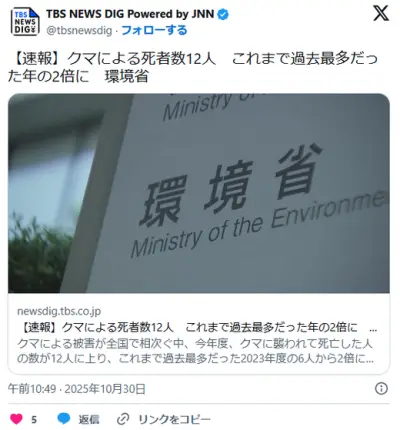 【(・(ェ)・)】クマによる死者数12人 これまで過去最多だった年の2倍に 環境省