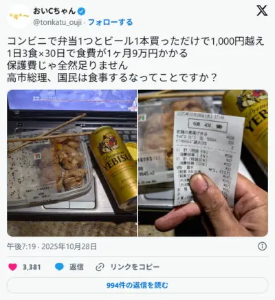 生活保護者「コンビニで弁当1つとビール1本買っただけで1000円超え。1日3食×30日で食費9万円。高市総理、食事するなって事ですか?」