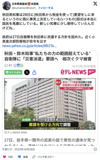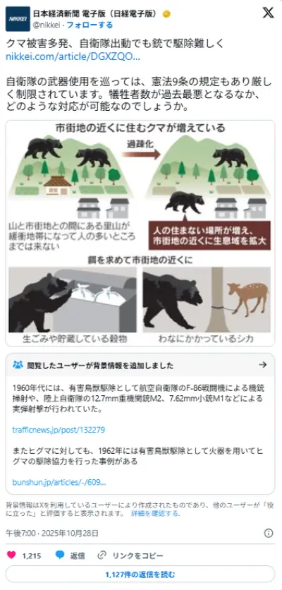 日経新聞「自衛隊は憲法9条があるので熊を撃てません」
