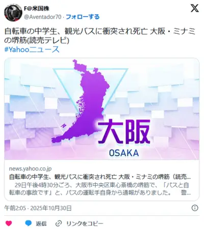 【大阪】自転車の中学3年生、観光バスに衝突され死亡 ミナミの堺筋